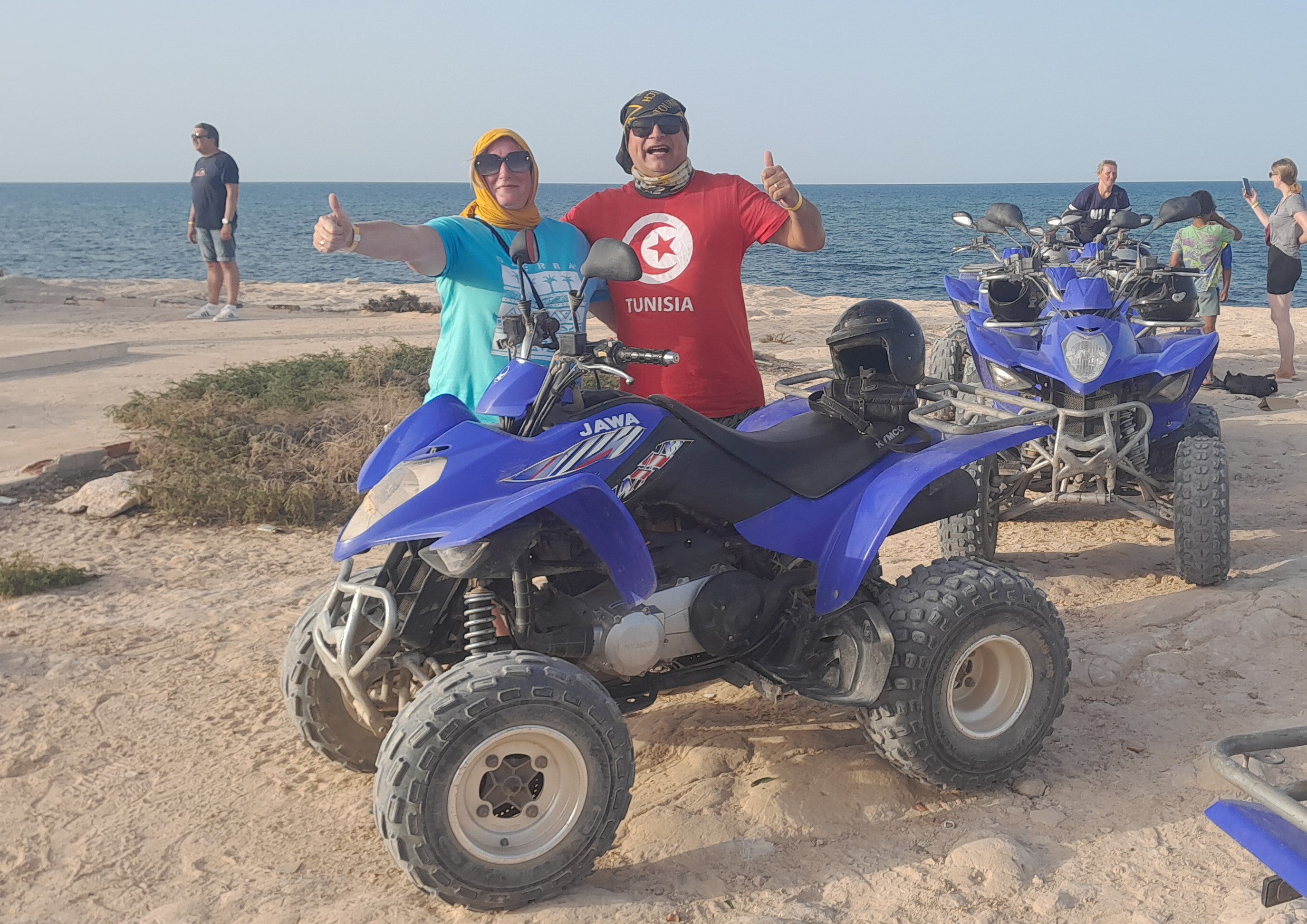 Zajímavosti: V Zarzisu jsme si půjčiili 4tyřkolku, ta naše měla opět na nádrži nálepku JAWA ,projeli jsme se městem, stepí, pláží, na útes a pouší bylo to super.