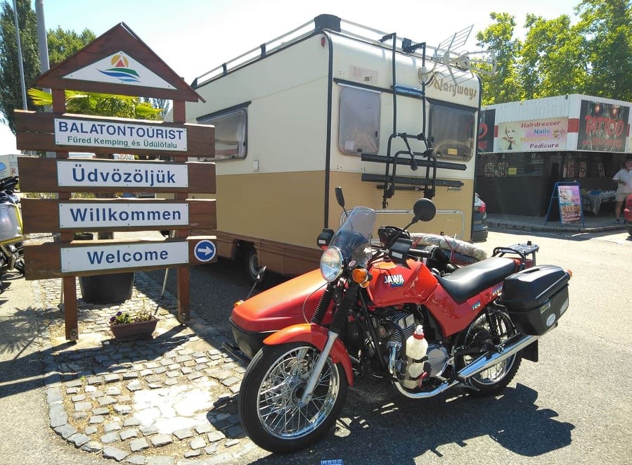 Jawa Tour 2020 - Vier Wasser byla vlastně z nouze po zavírání hranic, karanténách... Byl to nápad jak strávit motodovolenou v rámci možností. Proto 4ři vody.. Krucemburk (CZ) Otmuchów (PL) Zlaté Piesky (SK) Balatonfúred (H). Ujeto za 10 dní 1460Km. Ve výsledku to bylo super, počasí vyšlo, koupání, dobré jídlo... samozřejmě Knoblauch Creme zuppe :-D